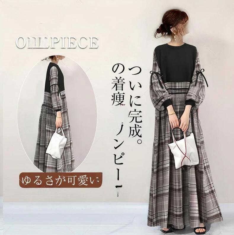 - L ワンピース レディース ラウンドネック ランタンスリーブ パッチワーク カジュアル ゆったり 可愛い オシャレ 着痩せ 大人