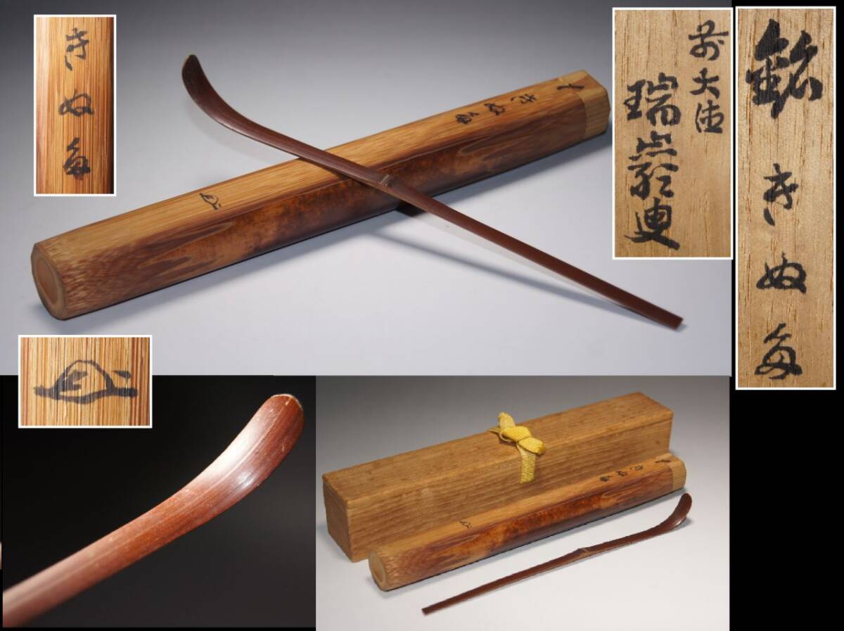- 真贋保証■後藤瑞巌 大徳寺9代官長■ 竹茶杓『銘 きぬた』花押 共箱・共筒 茶杓 茶道具 煎茶道具 茶具 茶会
