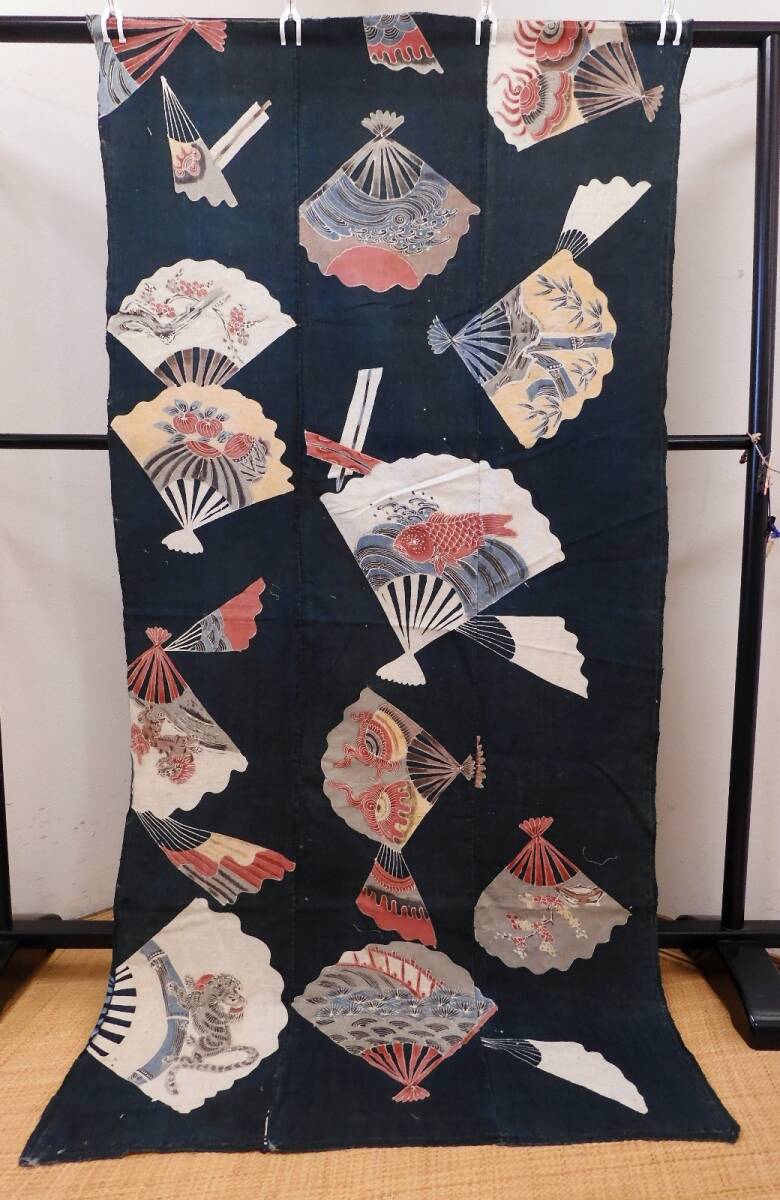 - <銀の斧>逸品・手描き木綿明治期前後の筒描き・扇面に虎や鯛の筒描3幅・多色