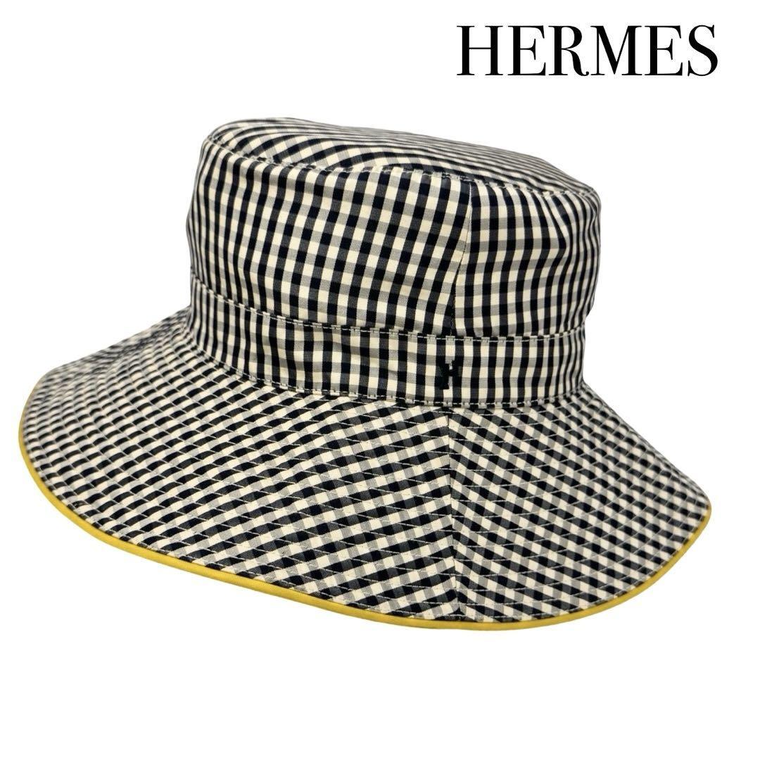 - HERMES エルメス Hロゴ シルク バケットハット 帽子 レディース 58サイズ チェック柄 つば広 イエロー