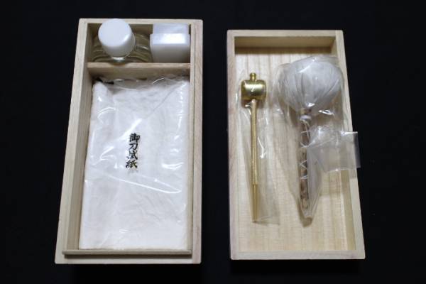 - 刀剣 保存 手入用具 桐箱入[5点セット] 小槌 打ち粉 刀剣油 拭い布 拭い紙 ◎油の無駄なし経済的 ☆説明書付 手入道具 手入れ用具 ☆新品