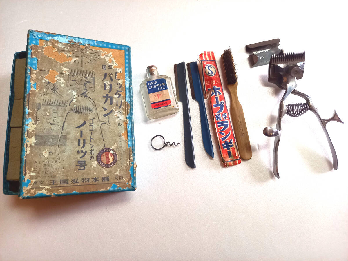 - 当時物 バリカン 昭和 レトロ アンティーク ヘアクリッパー 手動 理容器具 散髪 理髪店 金物屋 デッドストック ヘアオイル ビン カミソリ