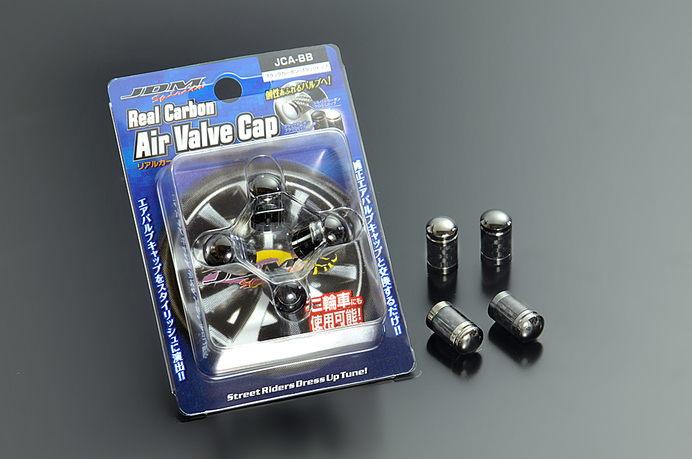 > 【アウトレット】JDM リアルカーボンエアバルブキャップ ブラックカーボン/ブラックトップ 4個入りセット 処分特価 ※パッケージ難あり