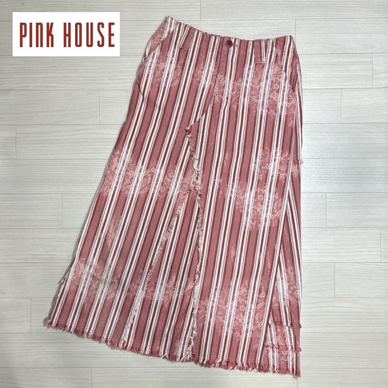 - PINK HOUSE/ピンクハウス/ストライプ×抜染加工/リメイクデニムスカート/フリンジ/台形スカート/ピンク~レッド系/Mサイズ