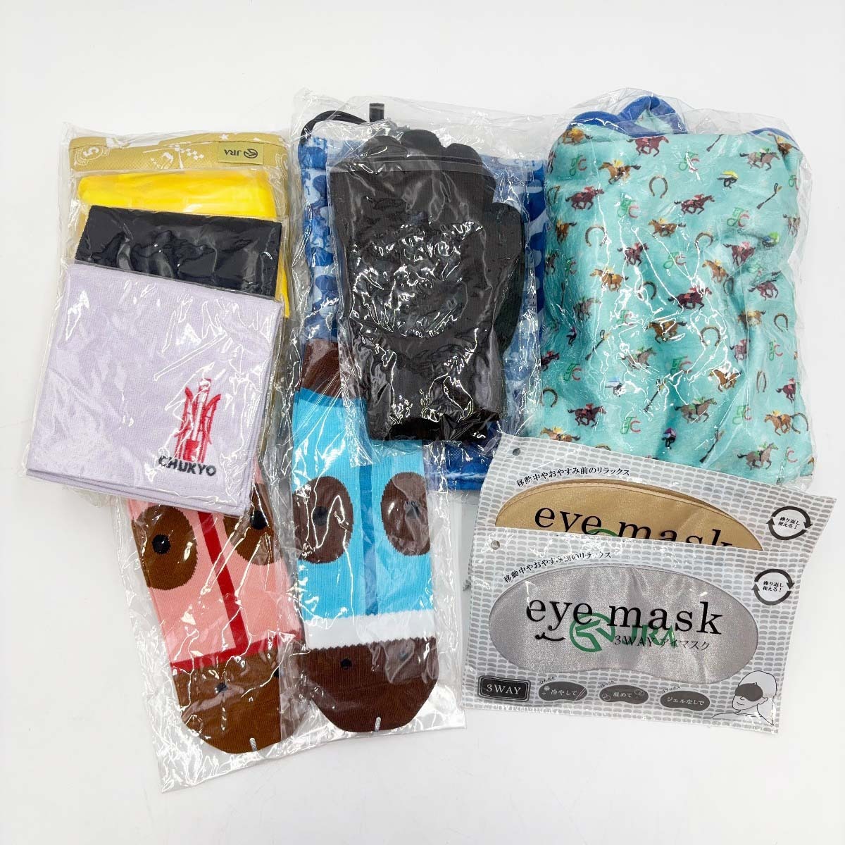 - 【中古・未使用品】[11枚セット] JRA 競馬 ミトン 手袋 ブランケット ハンカチ ネックウォーマー 靴下 他
