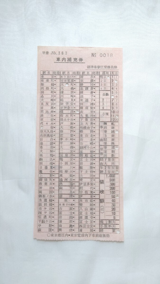 - ▲国鉄・沼津車掌区発行▲車内補充券▲軟券乗車券