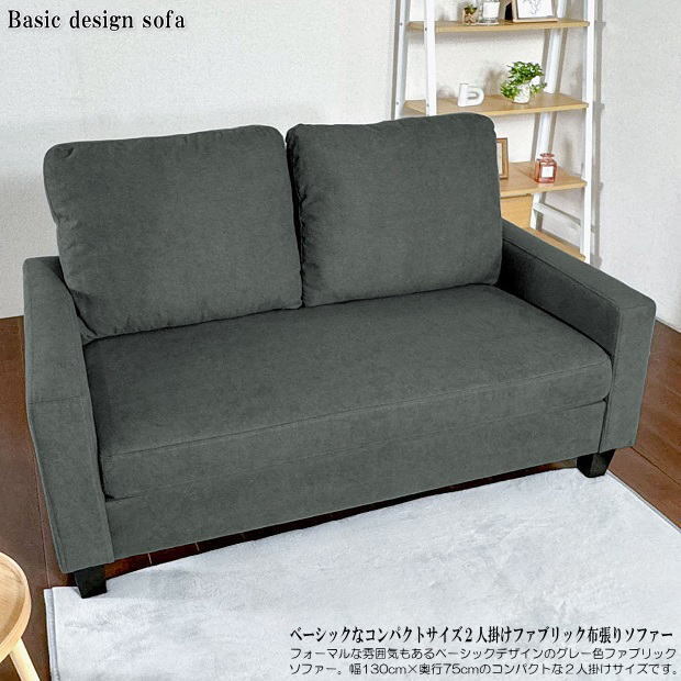 > ベーシックなコンパクトサイズ2人掛けファブリック布張りソファー グレー色 肘付 脚付 シンプル カジュアル スタンダード 和 洋 省スペース