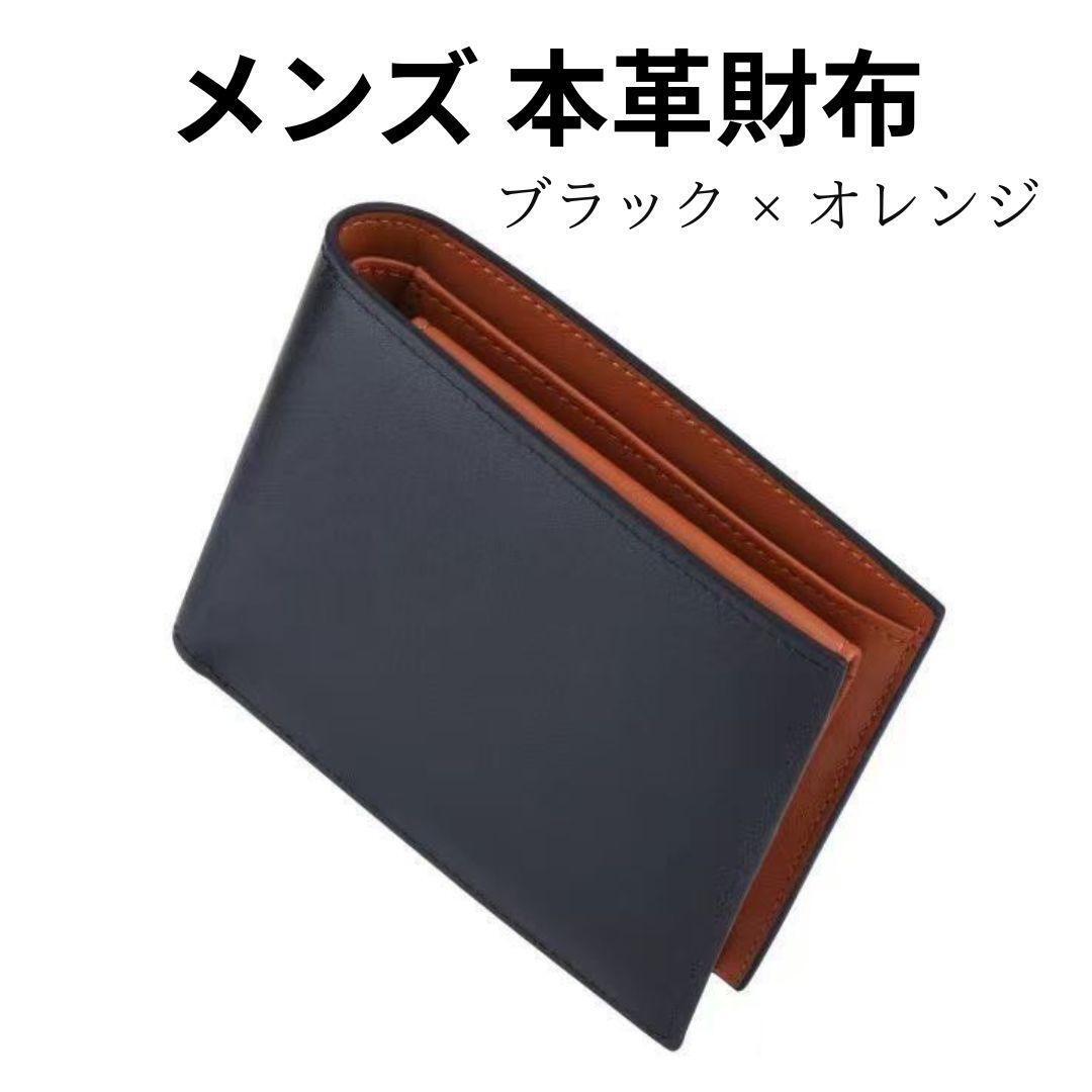 - 本革財布 ブラック 黒 オレンジ メンズ 二つ折り 財布