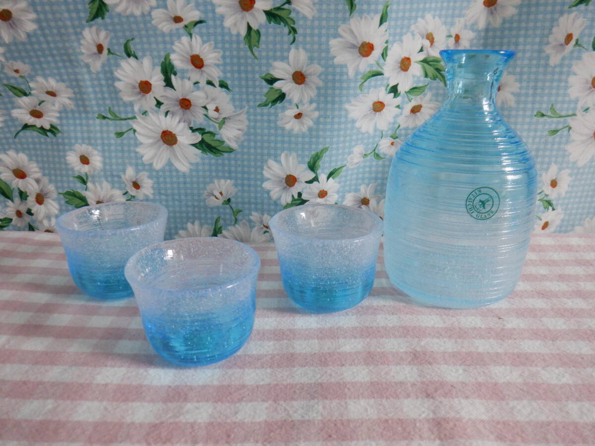 > E6『北一硝子 淡いブルーの泡ガラスの酒器セット~徳利&ぐいのみ3個まとめて』~箱なし 涼し気な色合いの酒器 長期保管品