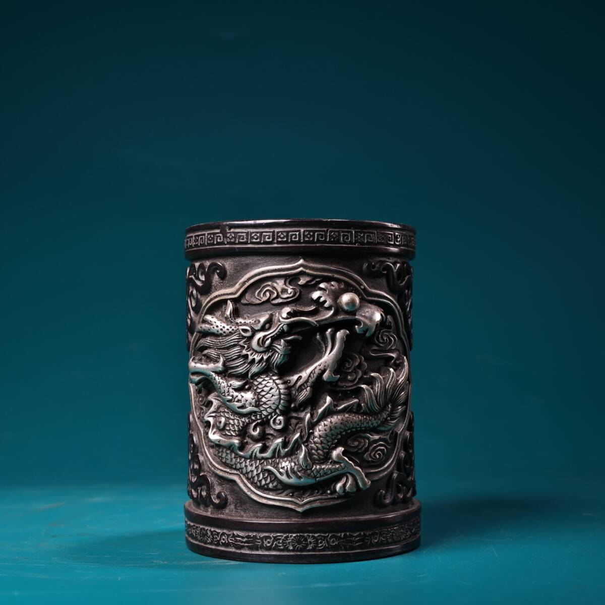 - 蔵友旧蔵出 銅製 銀鍍 神龍珠紋 筆筒 貴重品 置物 古賞物 中国古玩 中国古美術品