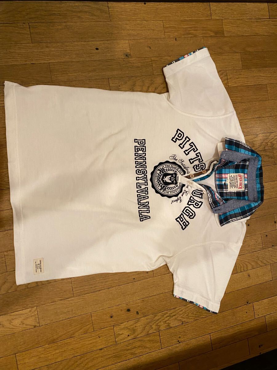 - 美品カレッジプリントTポロシャツ半袖チェックフェイクレイヤード重ね着カットソーマリンルックLサマーセーター