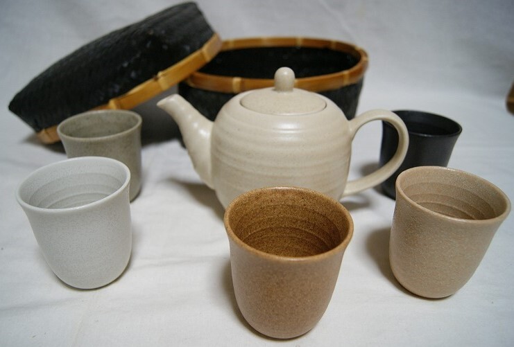 - A277★龍峰窯/未使用品オシャレな和風カップ茶器*竹籠入り付*急須・湯呑み高さ7cm 三洋陶器