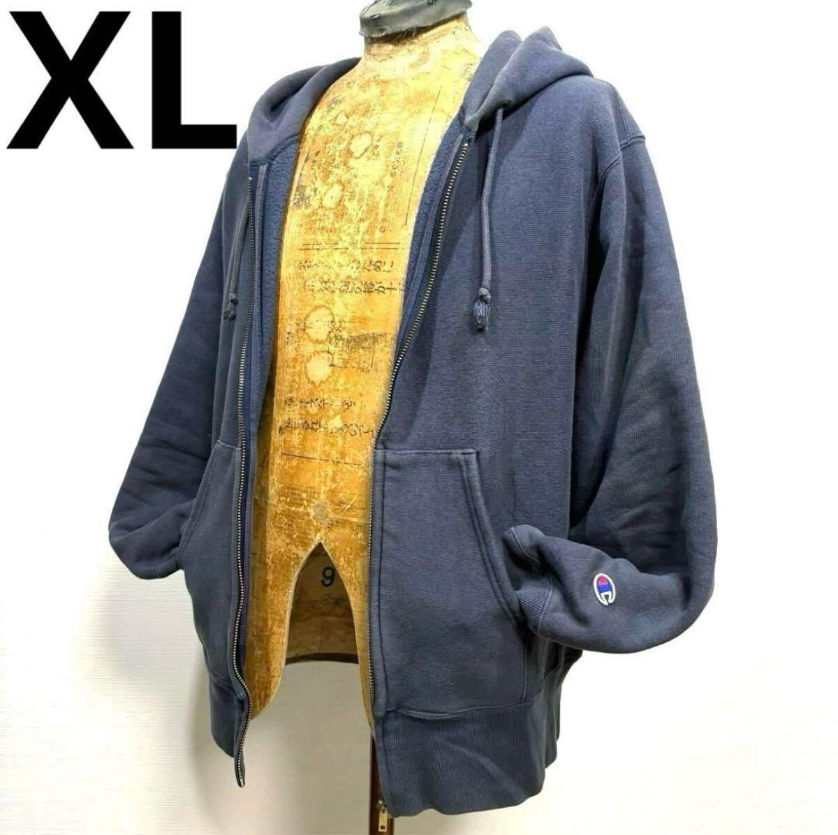 > XL 青単色タグ 紺 ネイビー チャンピオン リバースウィーブ ジップ パーカー 目無し 目なし ナス紺 古着 ゆるだぼ オーバー ビッグ