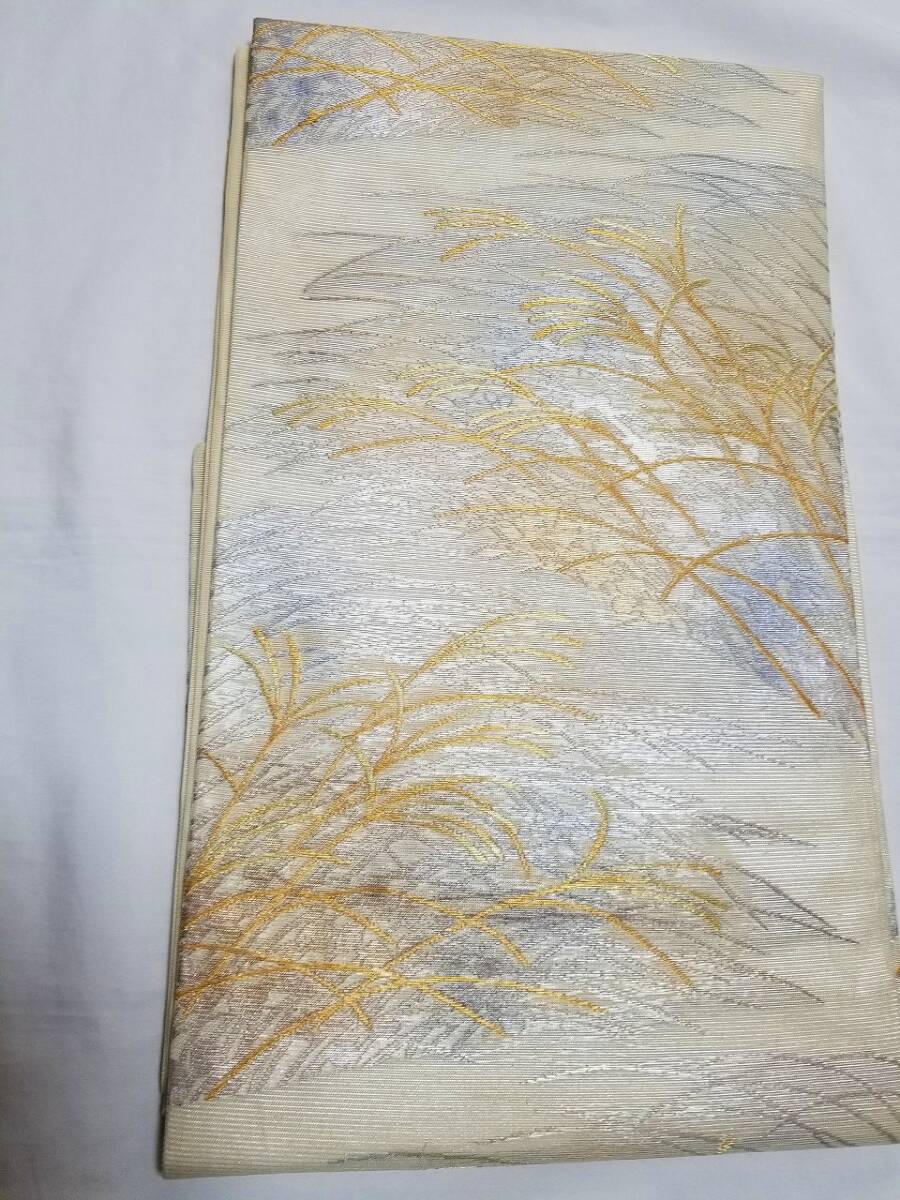 > 【桐徳】夏紗九寸帯☆送料無料*ススキ{正絹*西陣織*夏紗*九寸名古屋帯}*薄い赤み黄色地*香色の雲文の中に金.黄金.銀糸.織のススキ*№7231