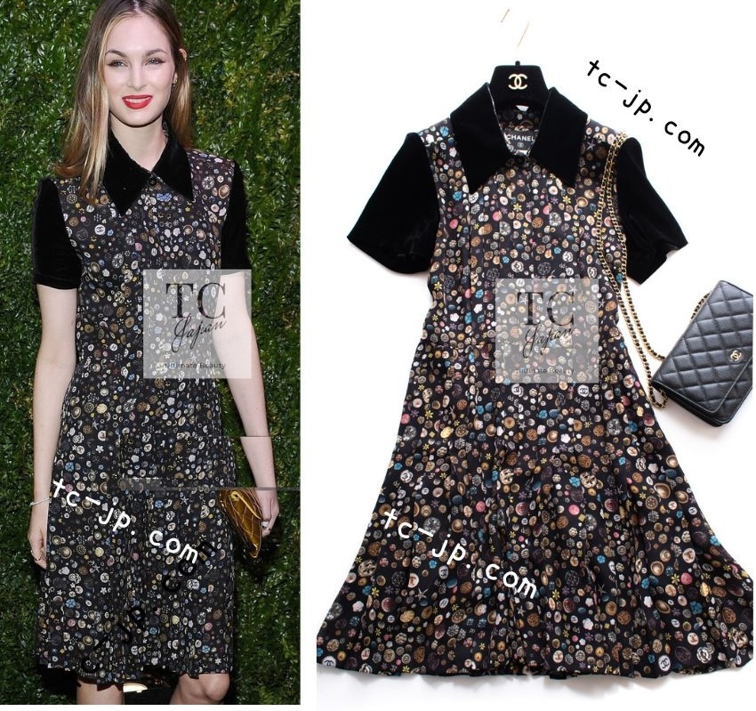 - シャネル サマー ワンピース CHANEL シルク CCボタン シリーズ 美人見えレア ベルベット 半袖 カールラガーフェルド 超美品 38【約9号/M】