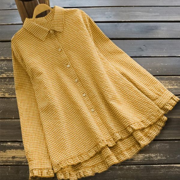 - 新入荷*カジュアル ナチュラル チュニック オフィス 通勤 シャツ チェック柄 フリル シャツ ゆったり 大きいサイズ 長袖 シャツブラウス*黄