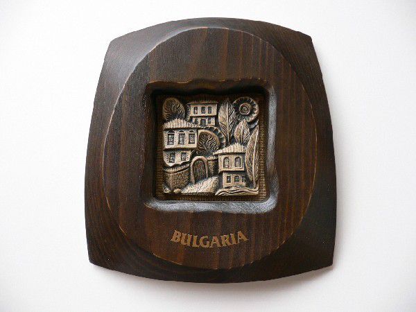 ブルガリアの街並みの陶額です。石畳の通りにブルガリアの昔ながらの家々が並んでいます。額は木をくりぬいたものです。