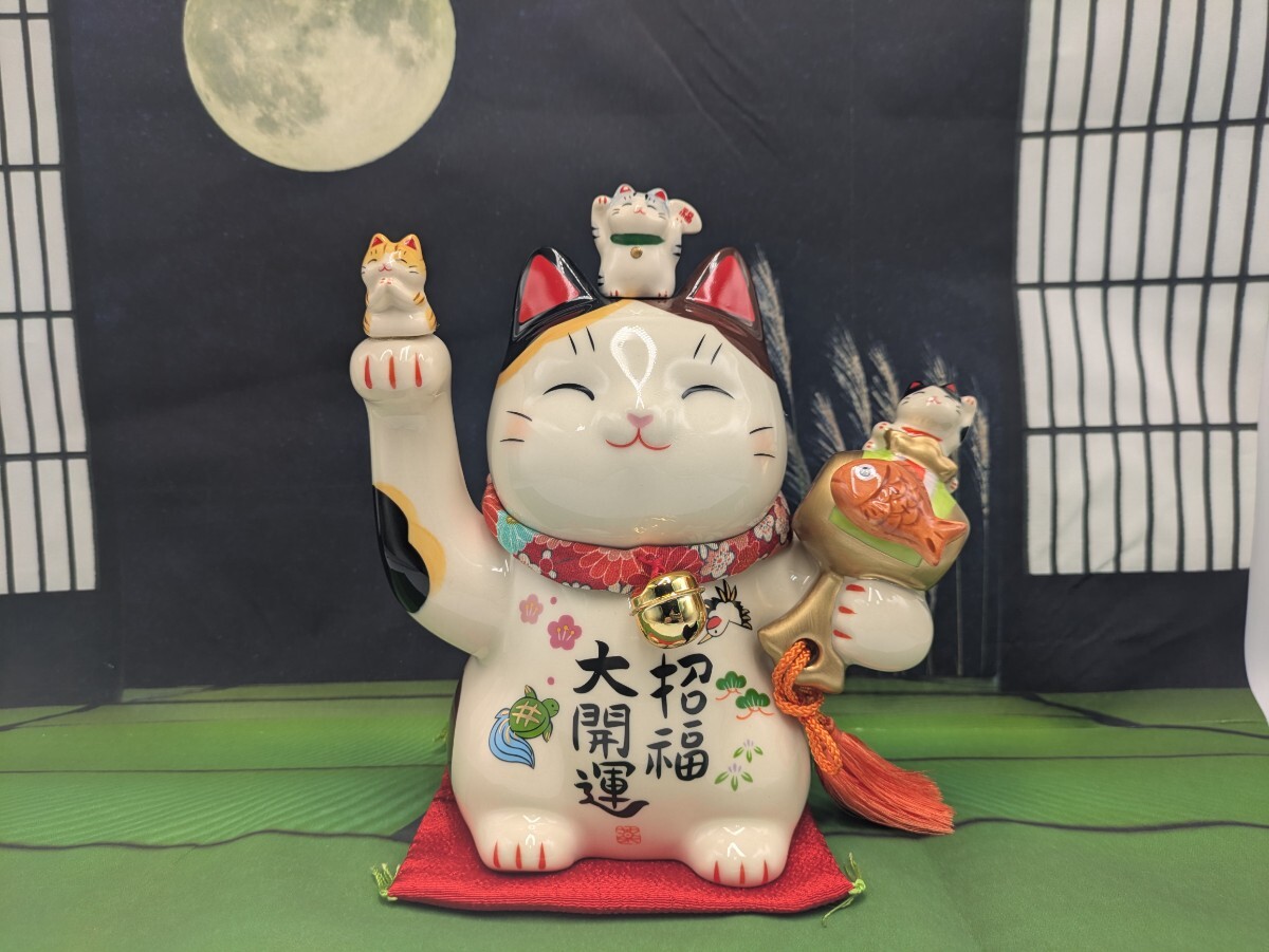 - 彩絵招福大開運招き猫 右手上げ ちりめん首輪付き 6号 薬師窯 座布団付き