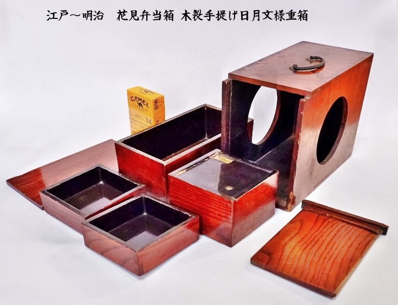 - アンティーク 江戸~明治 花見弁当箱 木製手提げ日月文様重箱 木目漆塗り 一人用 野弁当