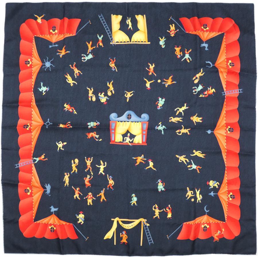 - 極美品 ブルガリ スカーフ BVLGARI シルク 100% 大判 正方形 サーカス ネイビー レッド 紺 赤 レディース OJ10403