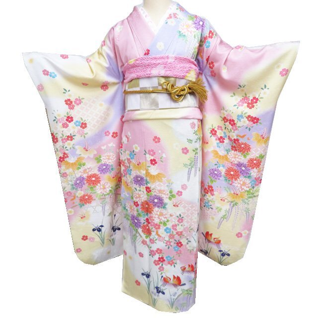 > 振袖 襦袢 2点 セット 着物 中古 正絹 花鳥模様 鴛鴦 マルチカラー 白色 薄紫色 多色 身丈158.5cm 裄66.5cm M きもの北條 A1207-1