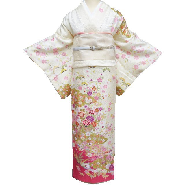 > 特選 訪問着 着物 中古 袷 フォーマル 流水に花の図 雲 地模様 淡黄蘗色 多色 金 身丈174.5cm 裄66.5cm L トール きもの北條 A1207-3