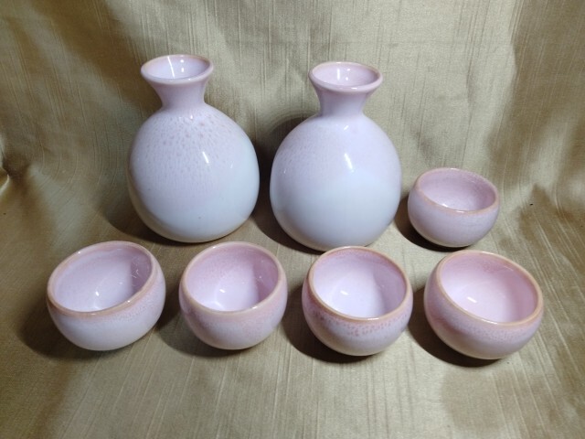 - 淡いピンク 酒器セット ずんぐり徳利は花挿しにも 古い未使用品 ぐい呑5x4cm