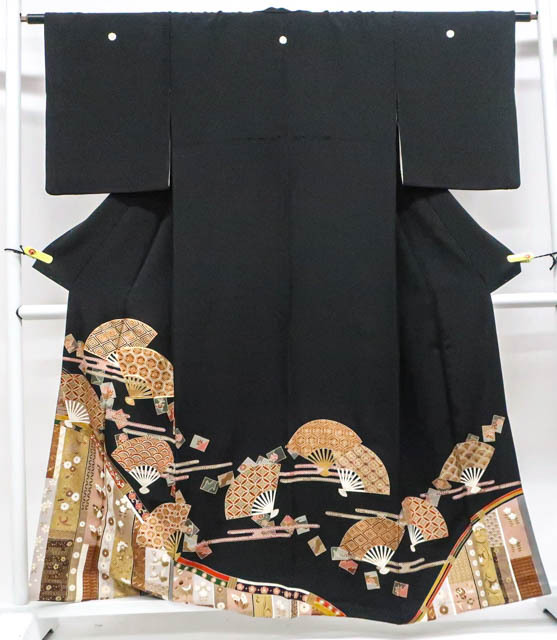 - 《古美術京松》【着物】黒留袖 五つ紋 比翼仕立て 金駒刺繍 扇子に古典柄 身丈約160cm 裄丈約63cm r7z06-602