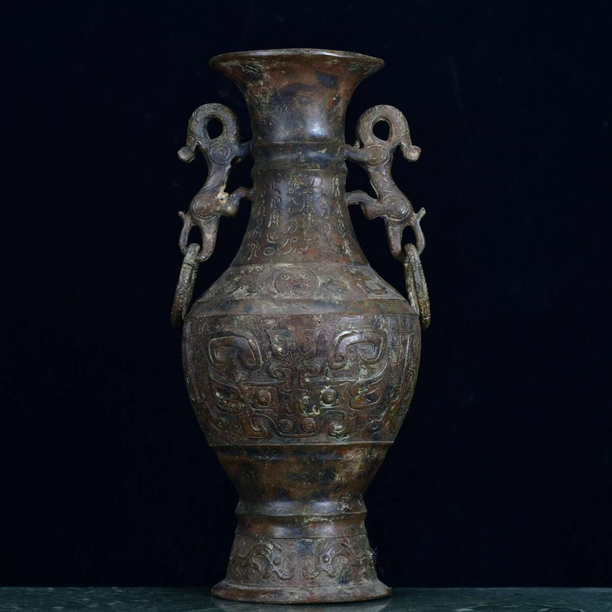 - 【超珍館蔵】漢 青銅製 獣面紋雙龍瓶 青銅器 置物 賞物 古賞物 古董品 古美術品 時代物 旧家蔵出 稀少珍蔵品