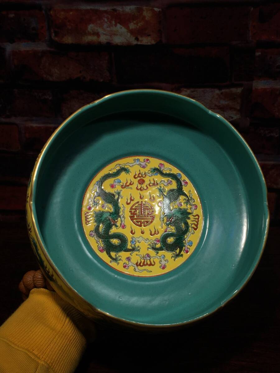 > 多宝閣 ■ 202145 中国磁器 中国骨董【エナメル磁器の黄釉龍鳳凰筆洗器と花皿】工芸品 施釉陶 陶芸 置物 收藏品 孤品