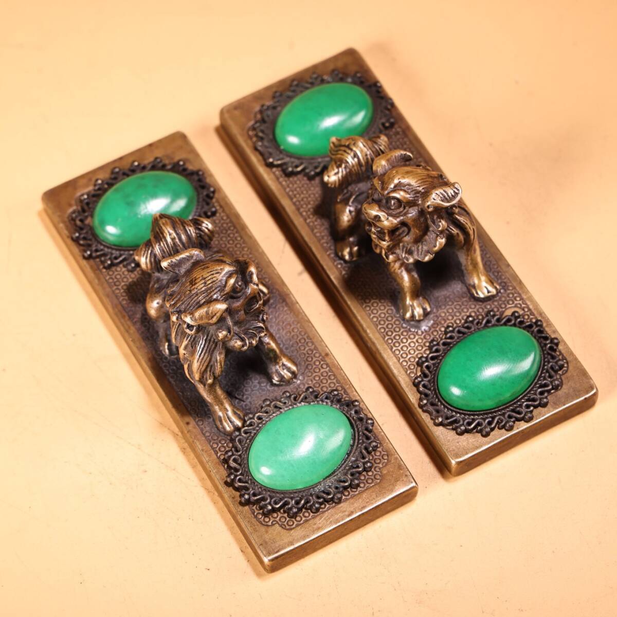 - 蔵友旧蔵出 銅製 寶石嵌 獅子鎮尺一對 希少珍品 貴重品 置物 古賞物 中国古玩 中国古美術品