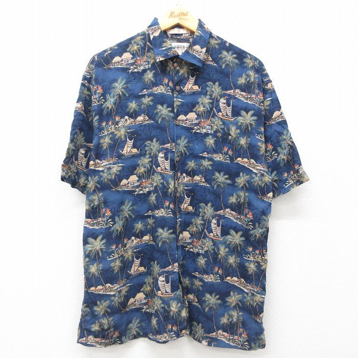 - L/古着 半袖 ハワイアン シャツ メンズ 00s ヤシの木 船 総柄 レーヨン 紺他 ネイビー 25jun10 中古 アロハ トップス