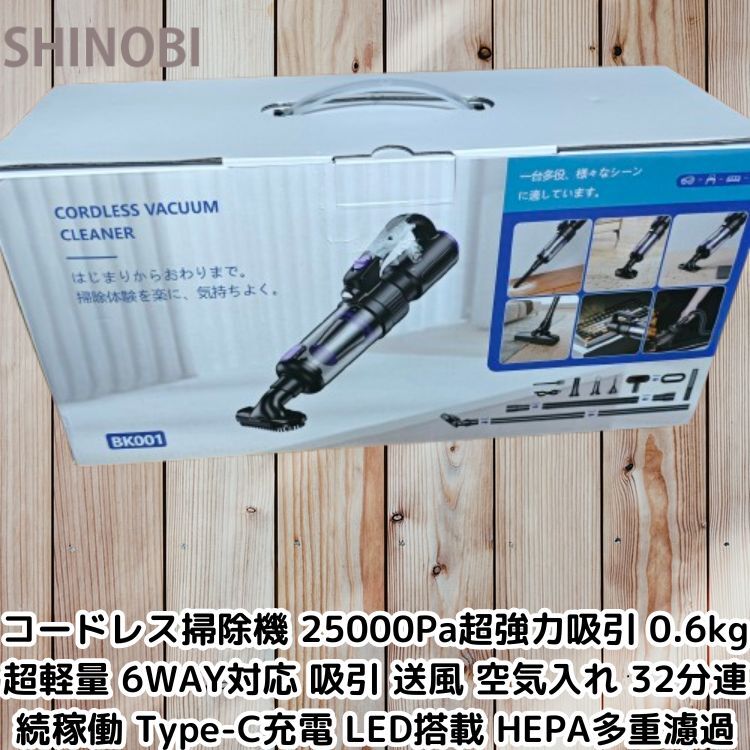 - コードレス掃除機 25000Pa超強力吸引 0.6kg超軽量 6WAY対応 吸引・送風・空気入れ 32分連続稼働 Type-C充電 LED搭載 HEPA多重濾過