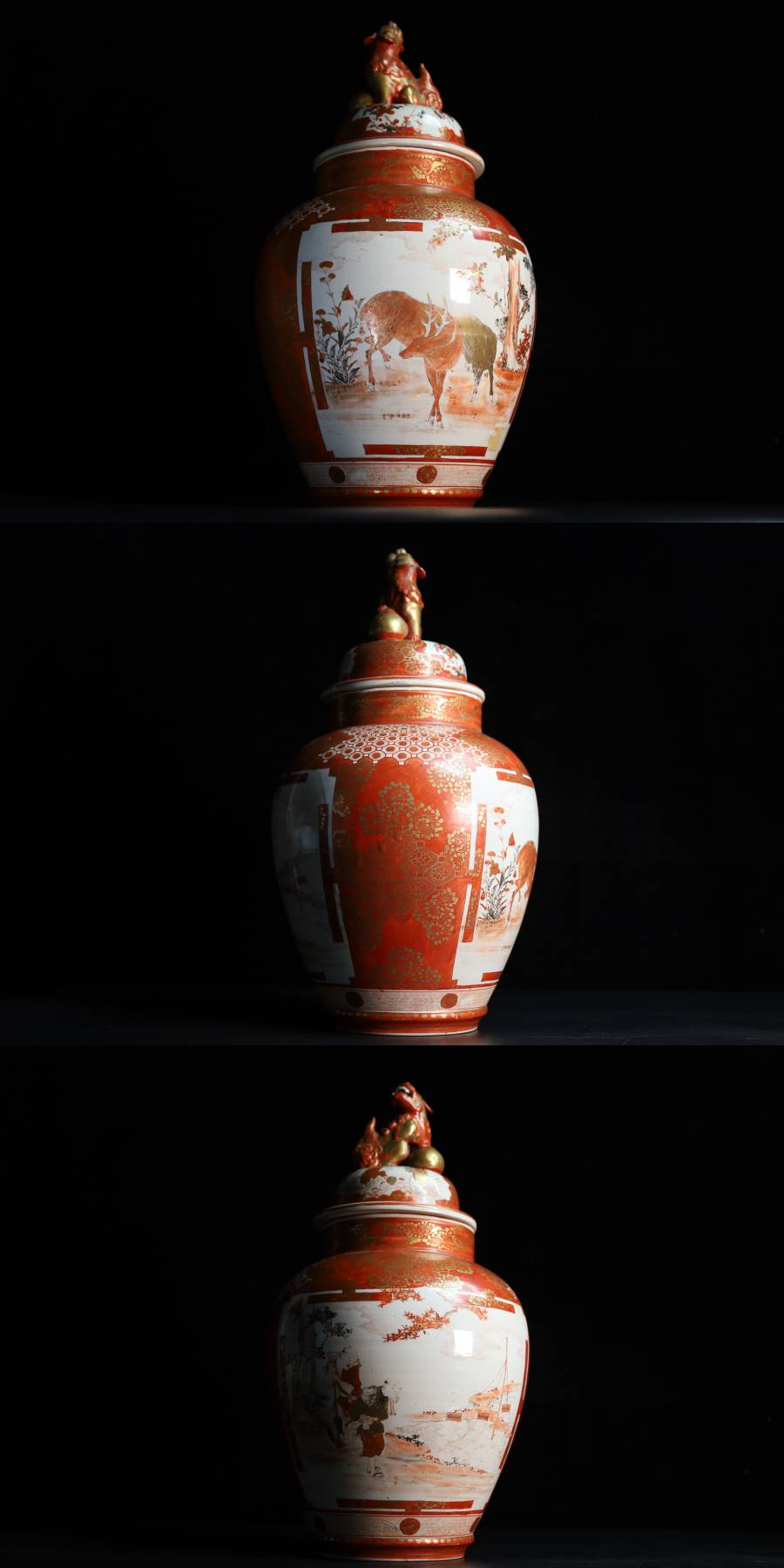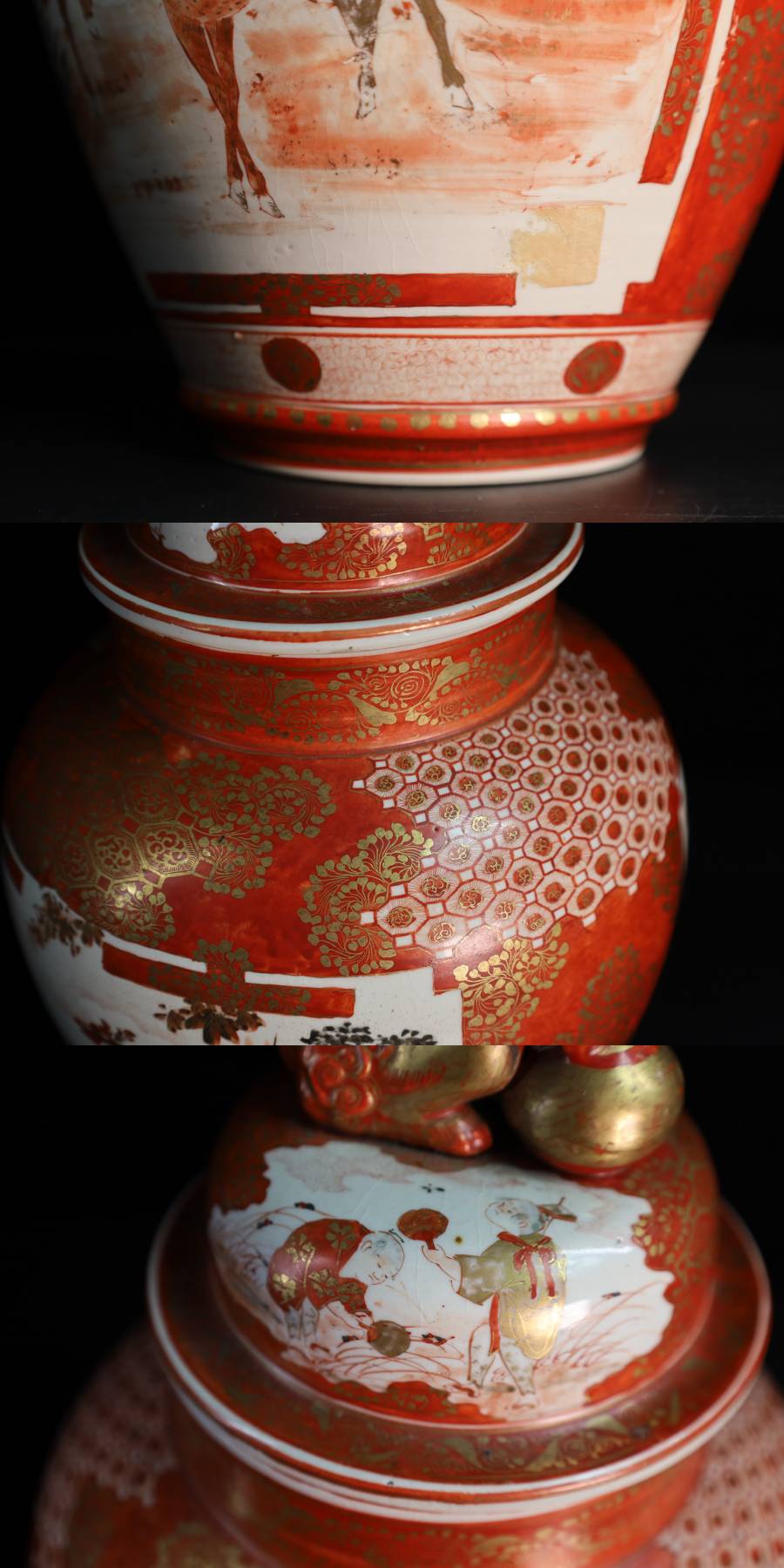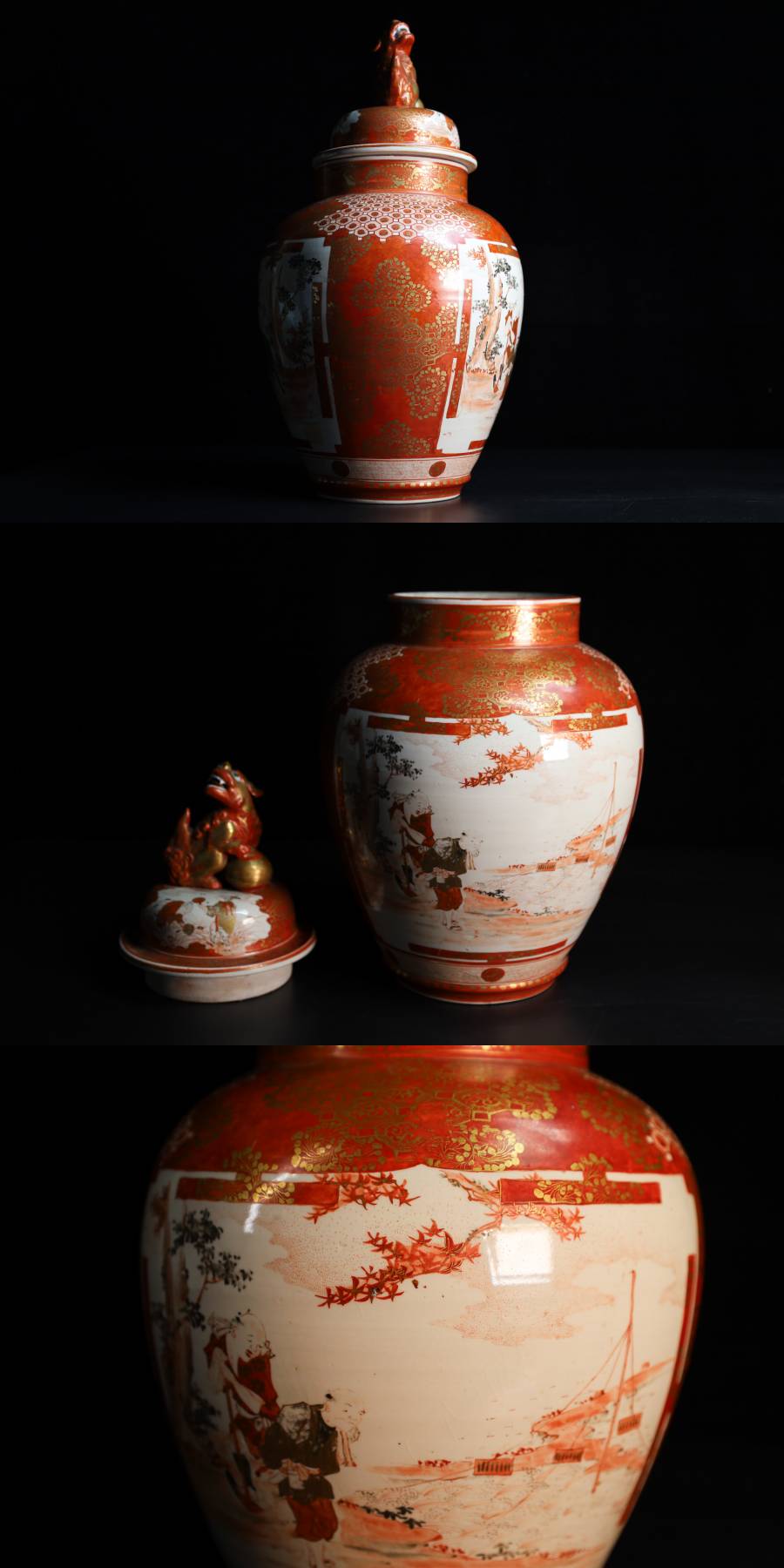- ◇雅◇ 古美術品 柳宣永 作 完松窯 大日本九谷製 高さc38cm/2495g 獅子摘み赤絵 蓋壷 九谷赤絵 時代物 共箱 /HK.25.5 [J109] TU