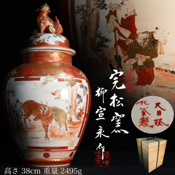 > ◇雅◇ 古美術品 柳宣永 作 完松窯 大日本九谷製 高さc38cm/2495g 獅子摘み赤絵 蓋壷 九谷赤絵 時代物 共箱 /HK.25.5 [J109] TU