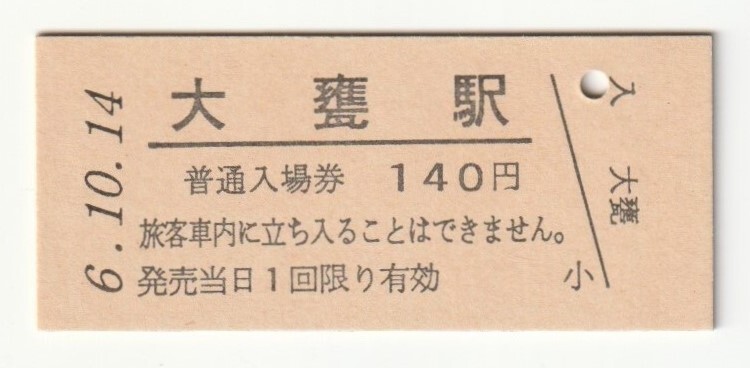 - 平成6年10月14日 常磐線 大甕駅 140円硬券普通入場券(日付印刷)