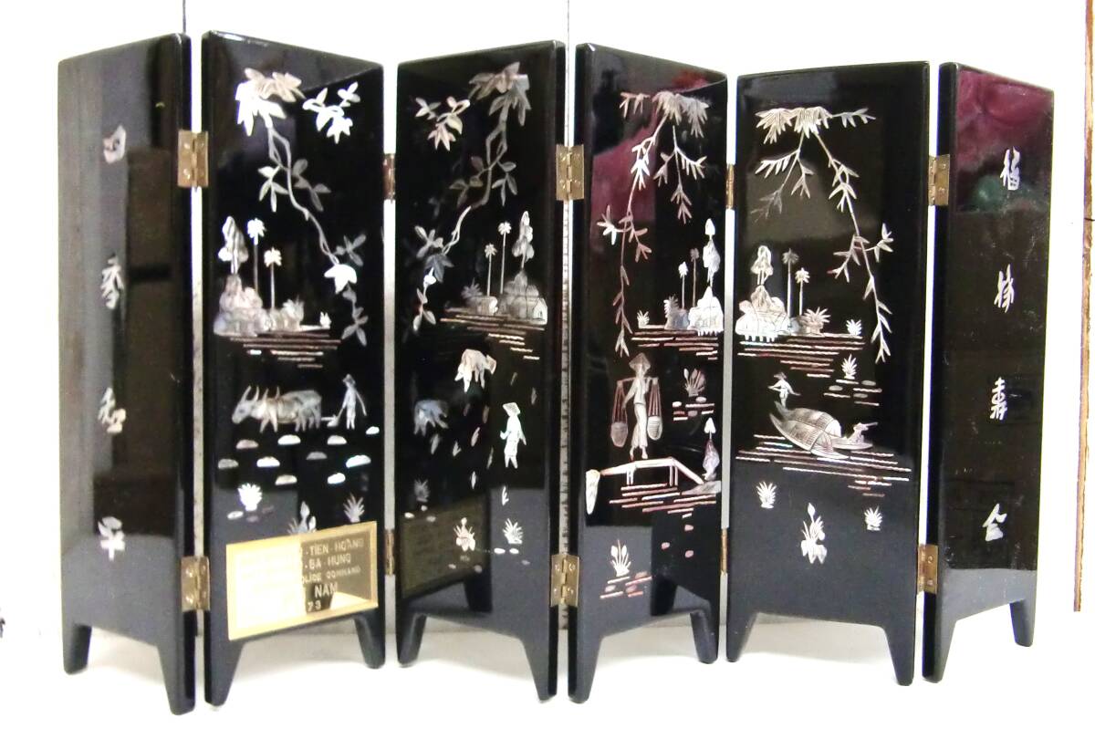 > アンティーク*両面屏風 ミニパーティーション 仕切り インテリア 置物 *螺鈿細工 貝細工 *金魚 人物 田植え風景 *韓国美術