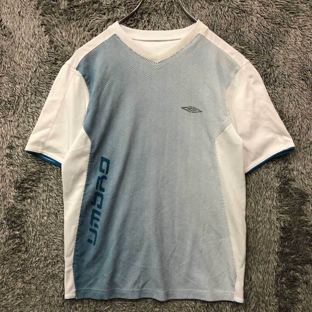 > UMBRO アンブロ Vネック スポーツ素材 半袖Tシャツ 半袖カットソー サイズS相当 ホワイト ブルー ロゴ メンズ トップス 最落なし(U)