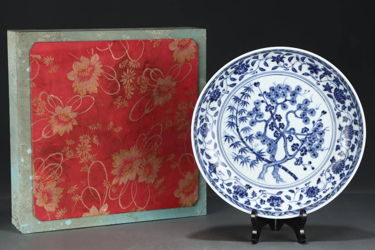> 多宝閣 ■202311 中国磁器 中国骨董【松、竹、梅の模様が描かれた明代の青白磁の大きな皿】工芸品 施釉陶 陶芸 置物 收藏品 孤品