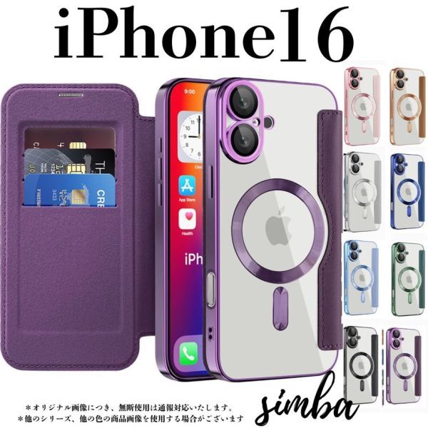 - iPhone 16 ケース 手帳型 カード収納 レンズ保護 レザー MagSafe対応 フリップケース パープルクリア