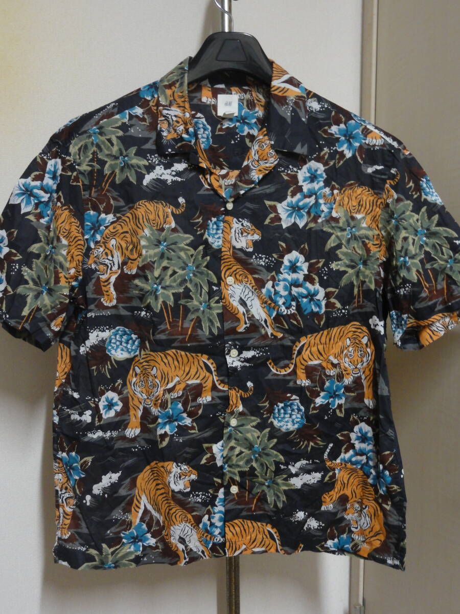 - 格安レア・H&M(エイチアンドエム)・ライトブラック系地?・和柄系・お洒落な虎トラ竹タケ?南国花等?総柄プリント入り半袖アロハシャツ系 M