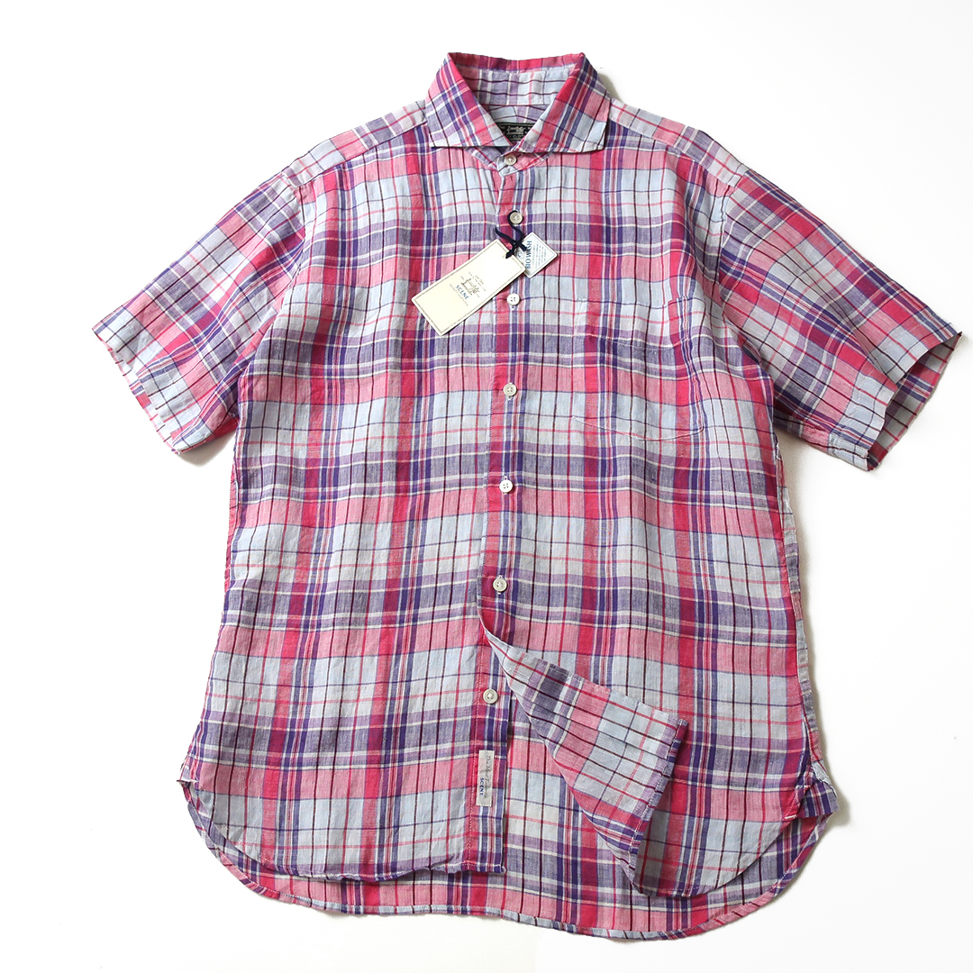 > 新品 SCENE カッタウェイカラー リネンシャツ TESSITURA MONTI ITALY生地 麻100% トーンオントーンチェック (M)
