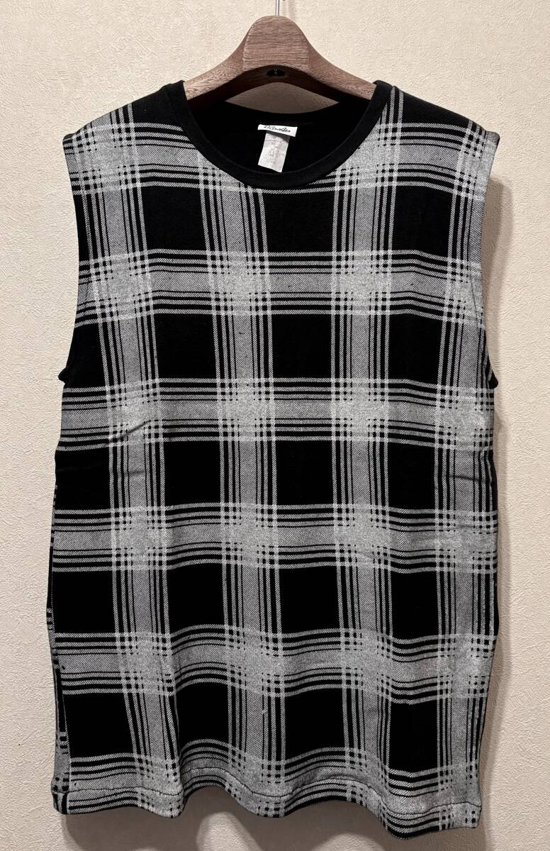 > 美品USA製90sオールド希少チェック柄ノースリーブTシャツLコットン黒/白プリント米国製/米製US製アメリカ製90年代ビンテージ(タンクトップ