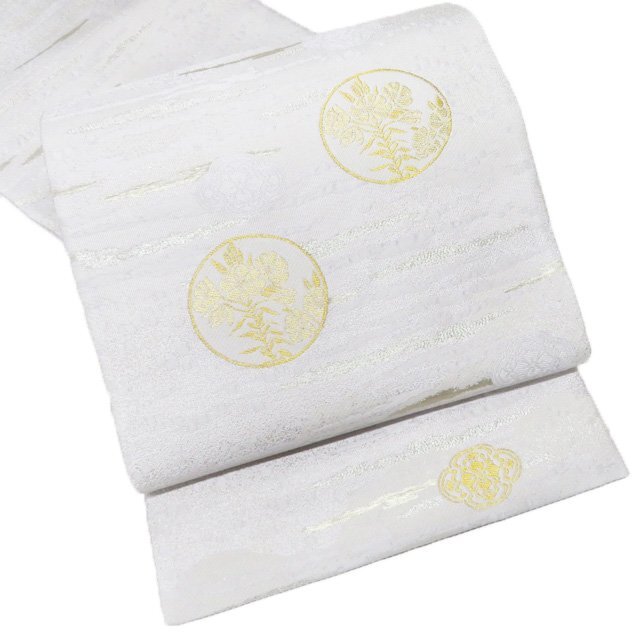 - 袋帯 未使用 正絹 フォーマル 仕立て上がり お太鼓柄 花の図 誕生花 松宵草 箔糸 白鼠色 金銀 きもの北條 A1215-12