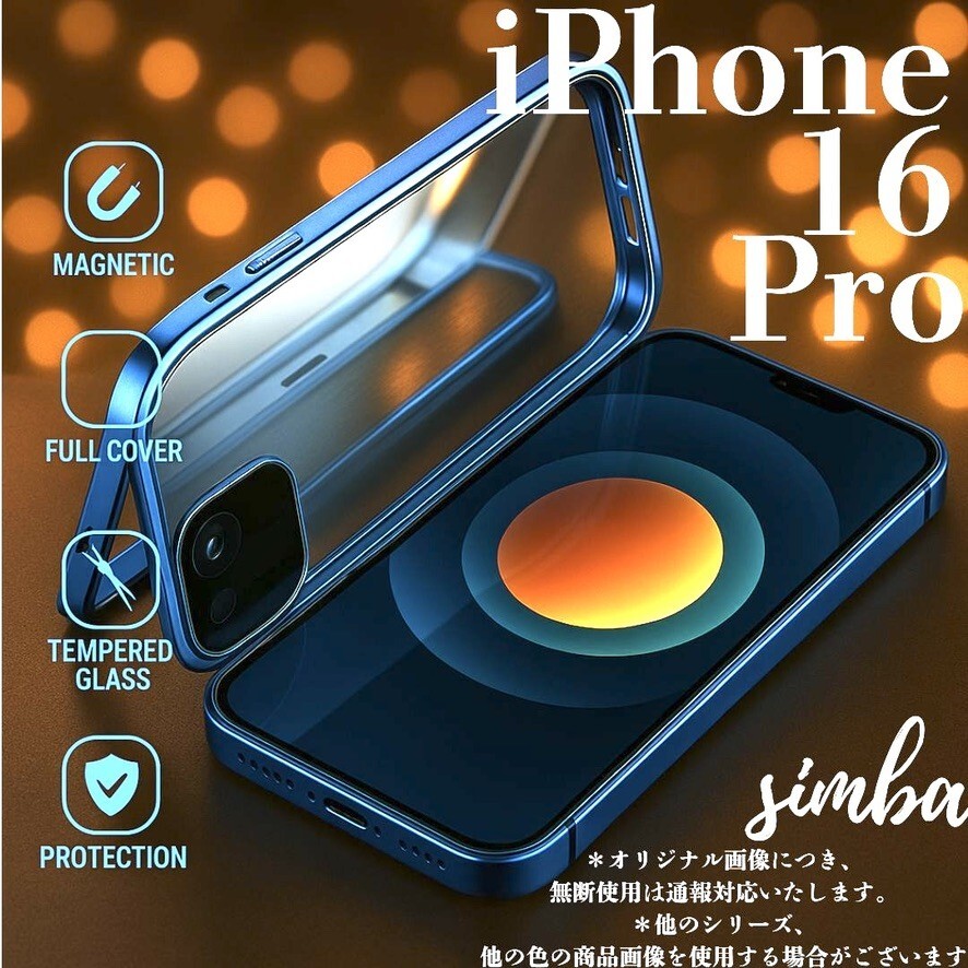 - iPhone 16 Pro ケース ブルー 両面強化ガラス フルカバー 360度保護 高耐久 レンズ保護 おしゃれ 大人 韓国 クリアカバー