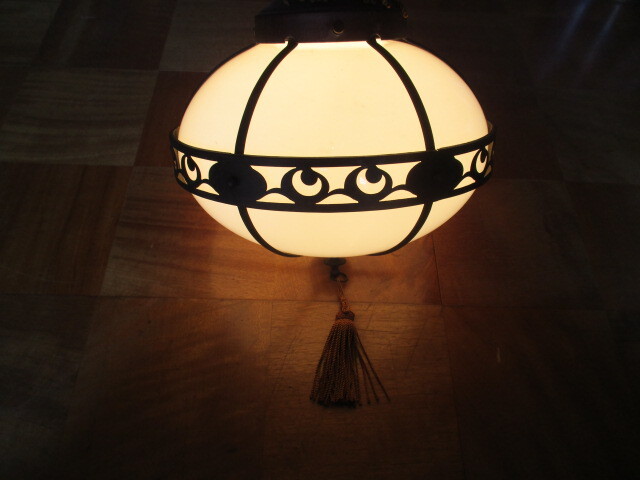 - 真鍮装飾付きぼんぼり乳白ガラス照明金具付き 電笠電気ランプ照明インテリアレトロビンテージアンティーク
