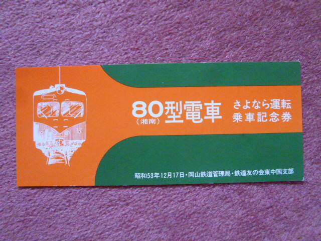 > 80型[湘南]電車さよなら運転乗車記念券1枚(国鉄/岡山鉄道管理局/日本国有鉄道/鉄道友の会東中国支部/昭和53年12月17日)
