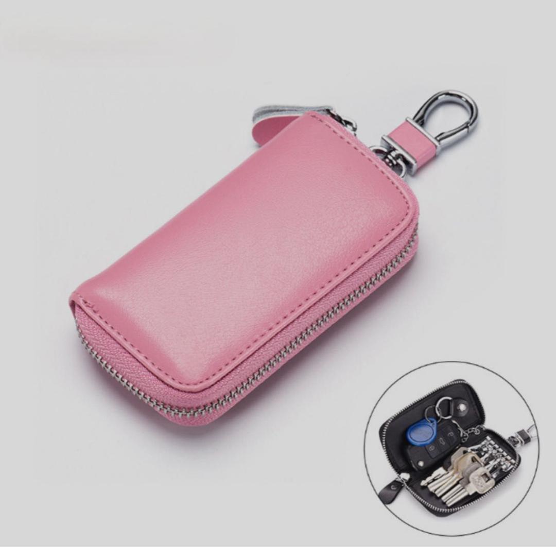 - 【ピンク】スマートキー対応 本革調キーケース 多機能収納 カード・小銭もOK♪