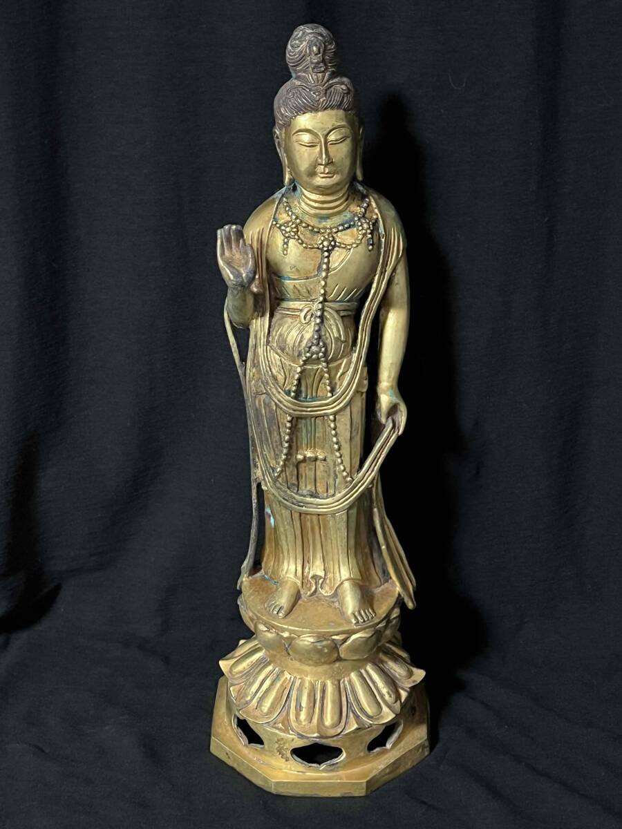 > 唐時代 金銅宝珠観音菩薩立像 金銅仏 銅塗金 唐物 仏教用品 仏像 唐物 時代物 旧家蔵出し 希少貴重 精密繊細 中国骨董(B-62)