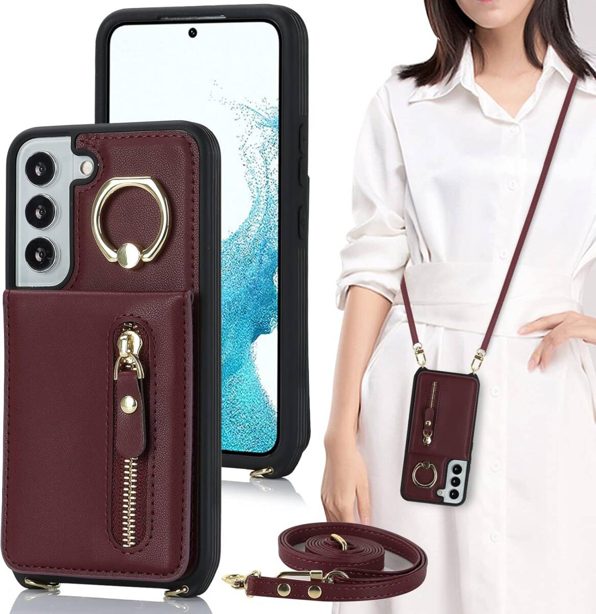 > S22 Galaxy ケース ショルダー リング付きケース 上下開 手帳型 財布 case 適用 【iCoverCase】 リング カードケース ワインレッド